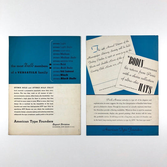 American Type Founders 2 x type specimen leaflets: Stymie Bold and Park Avenue