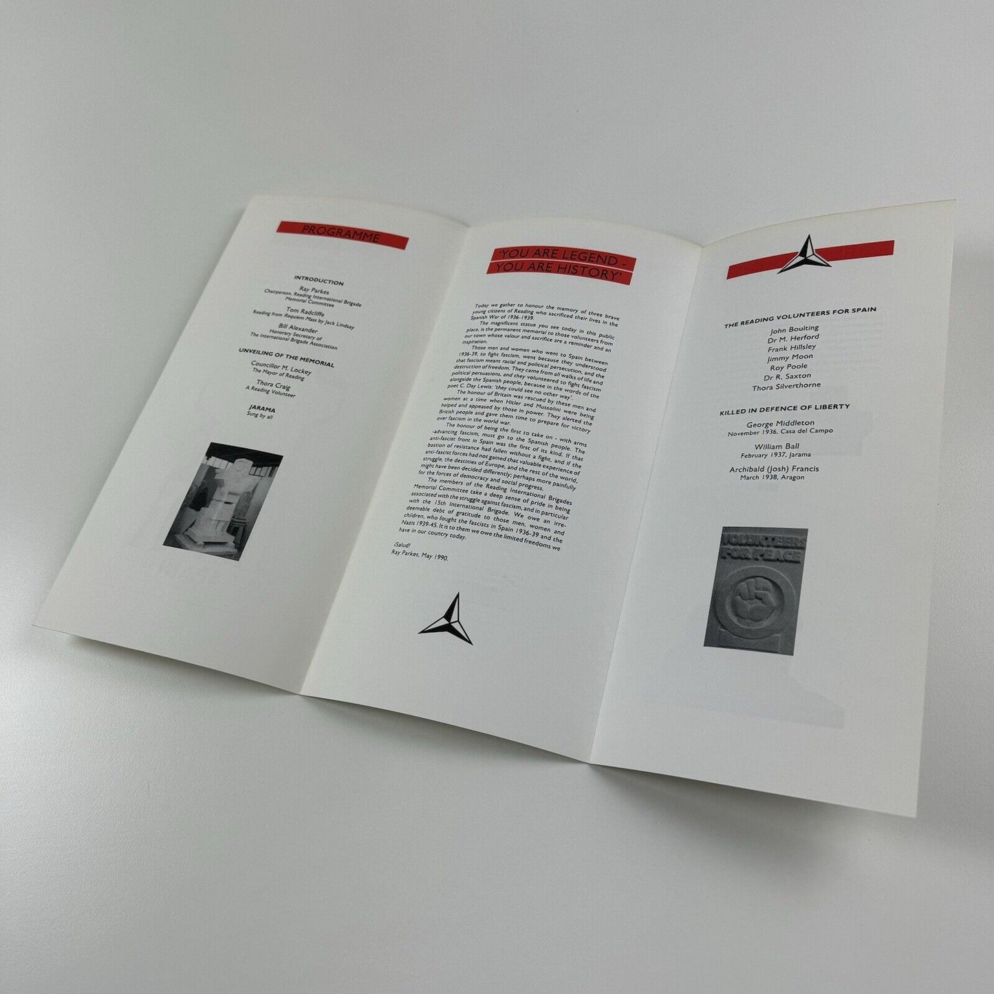 Leaflet to accompany the unveiling of the memorial to Reading citizens, who, as soldieries in the ranks of the British Battalion of the legendary 15th International Brigade, died fighting fascism in the Spanish War of 1936-1939.